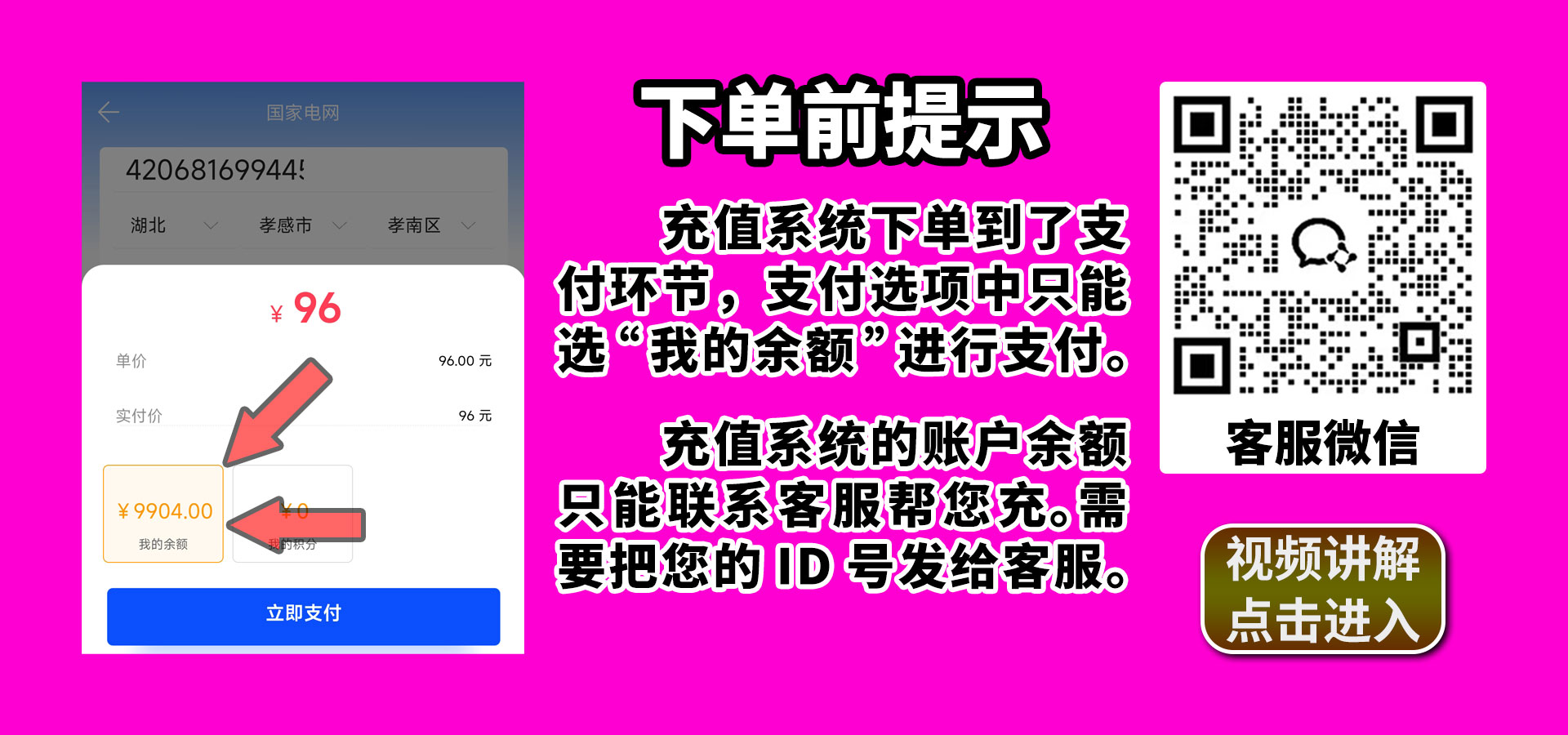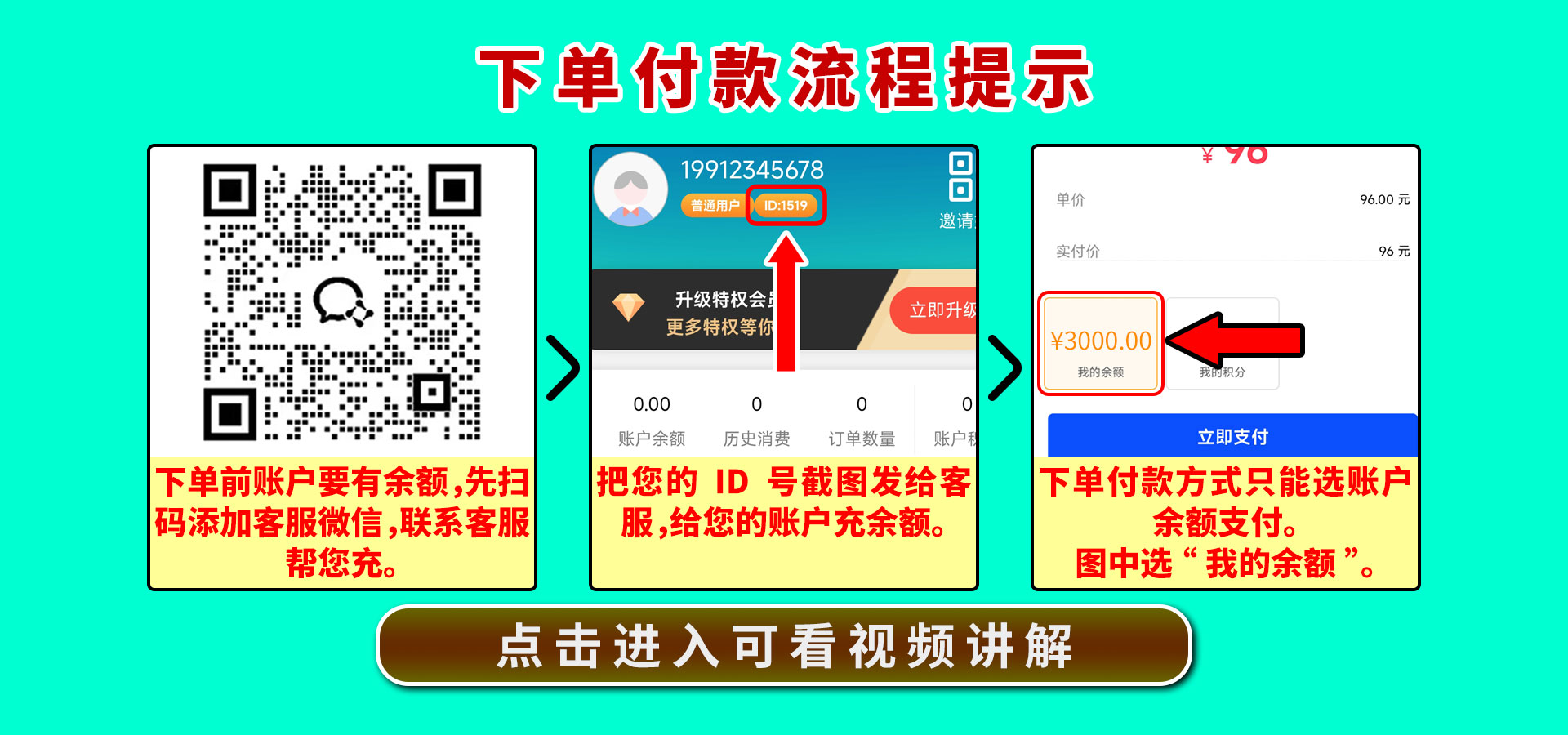 1.下单支付时,只能使用系统里的账户余额支付。如果您的账户余额不足,请联系客服给您充值账户余额。充值金额付给客服把您的ID号截图发给客服,即可给您账户充钱。 2.下单前一定要看充值规则。